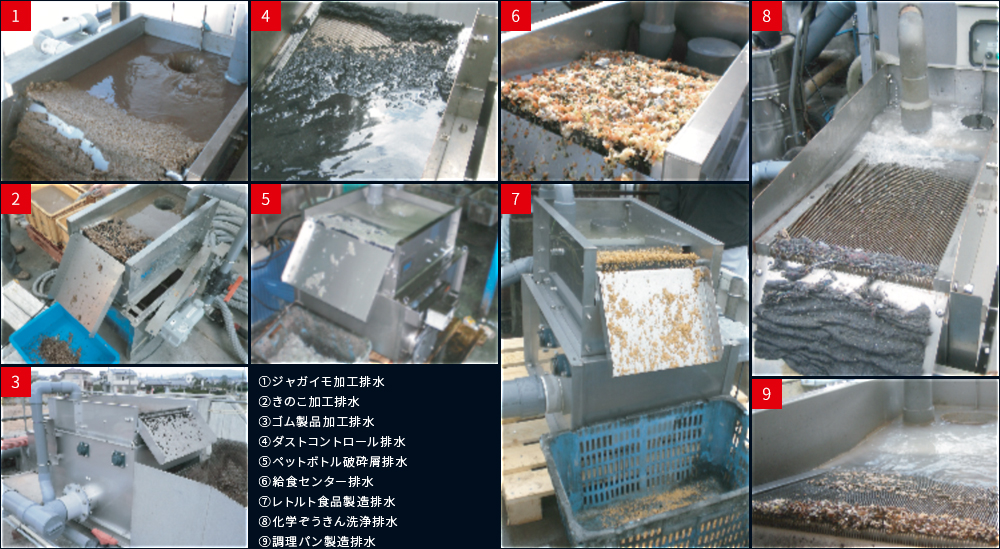 排水源が炊飯工場及び米菓工場において、ろ過部の裏側に生物膜が繁殖して氷柱のようになり、ろ過機能が維持できない事例が発生しております。このように、ろ過部プレートに付着して微生物の繁殖が予測される排水にはご採用を見合わせてください。牛脂やショートニング等を含む油分は常温で固形化するため正常処理ができません。