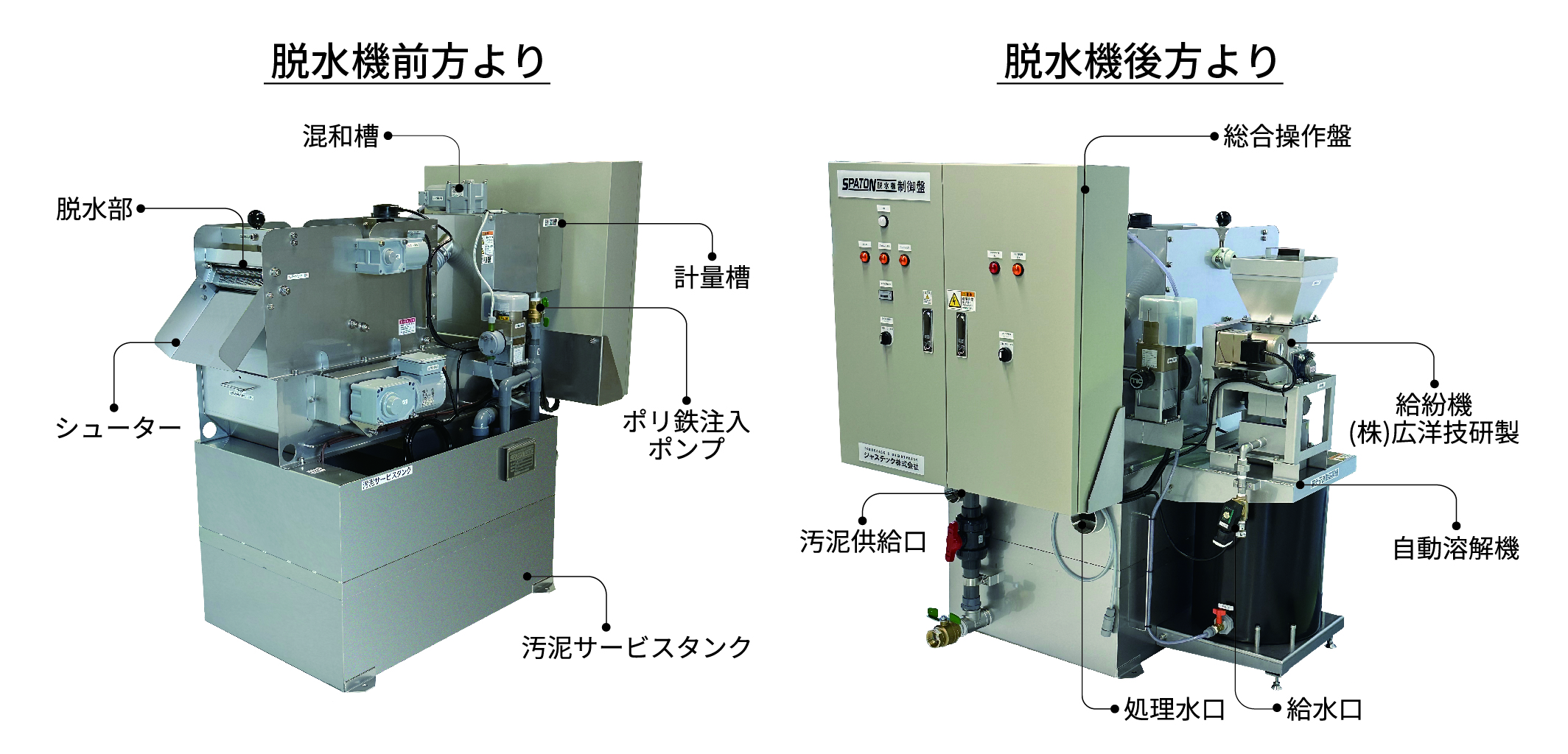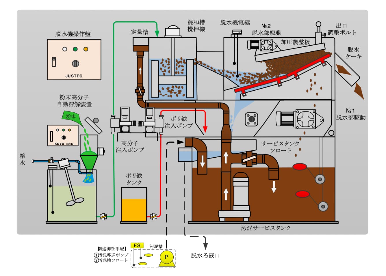 ①汚泥サービスタンク及び汚泥供給ポンプ②混和槽及び定量槽③脱水機本体④粉末の自動溶解装置及び高分子注入ポンプ⑤ポリ鉄貯留タンク及びポリ鉄注入ポンプ⑥自動運転可能な操作盤が、一体化。