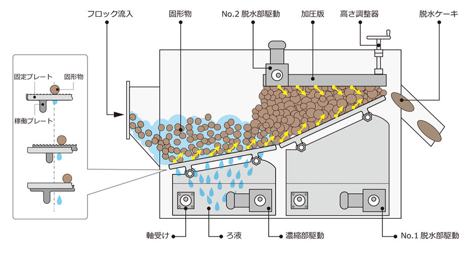 固定プレートと稼働プレートをそれぞれプレート群とし、各プレートが交互に配置されるように組み合わせられることで平面上ろ過面を形成しています。さらにろ過面を覆うように加圧板が取り付けられ内圧が加わり脱水される仕組みです。
