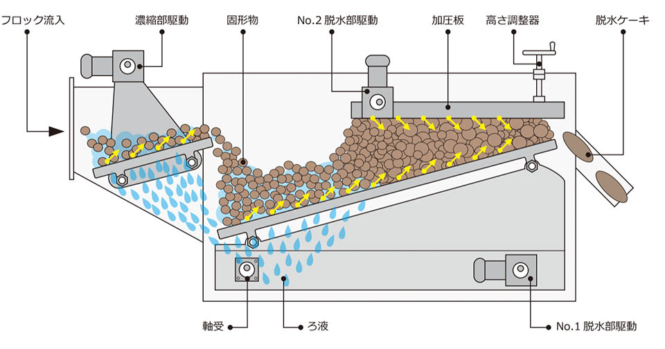 ① 汚泥に凝集剤を添加してフロック化され、ろ過面に流れ込みます。